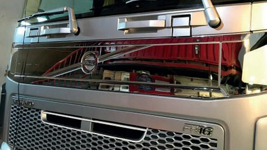 - Декорация за монтаж под предното стъкло, над решетката на Volvo FH4. Придава стилен и завършен външен вид на камиона, като подчертава линиите на кабината. Изработена от устойчив материал за дълготрайна експлоатация и защита от леки механични повреди и атмосферни влияния.